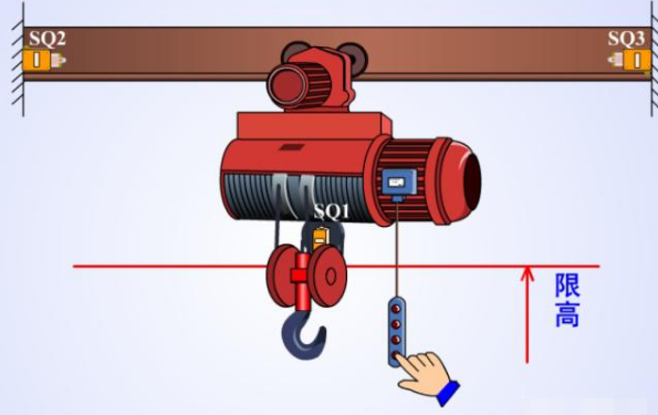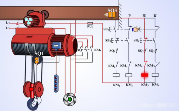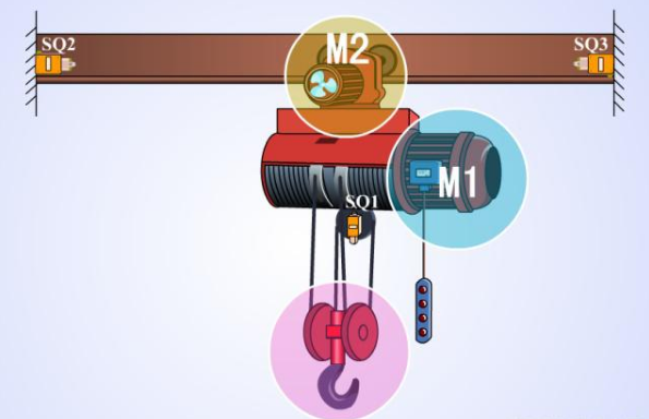 首先電葫蘆有兩個(gè)電機(jī)組成,分別是M1上 下,M2--左--右,左右的兩邊分別有限位器,就是行程開關(guān)用來限制導(dǎo)軌上面的電機(jī)不會(huì)因?yàn)檎`操作損毀設(shè)備。上的時(shí)候也有位置限制。