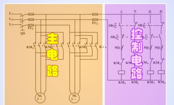 大家看下圖,其實(shí)電葫蘆就是兩個(gè)電機(jī)正反轉(zhuǎn)電路,我們只要把控制電路掌握好就可以。